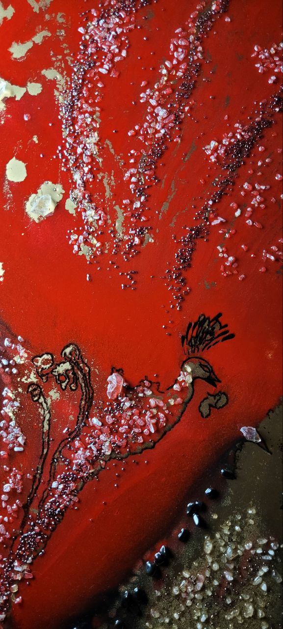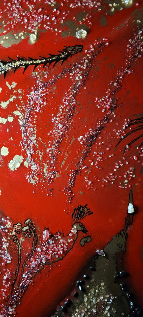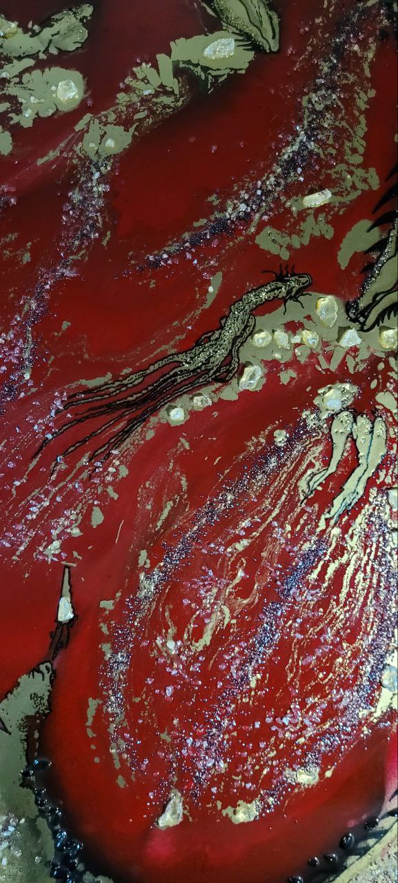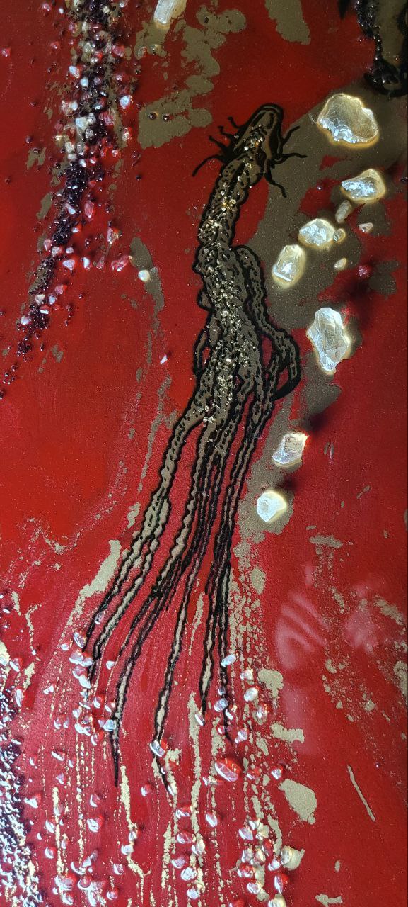 Epoxy resin, acrilic, gold pegment, rhinestone, obsiden, garnet
