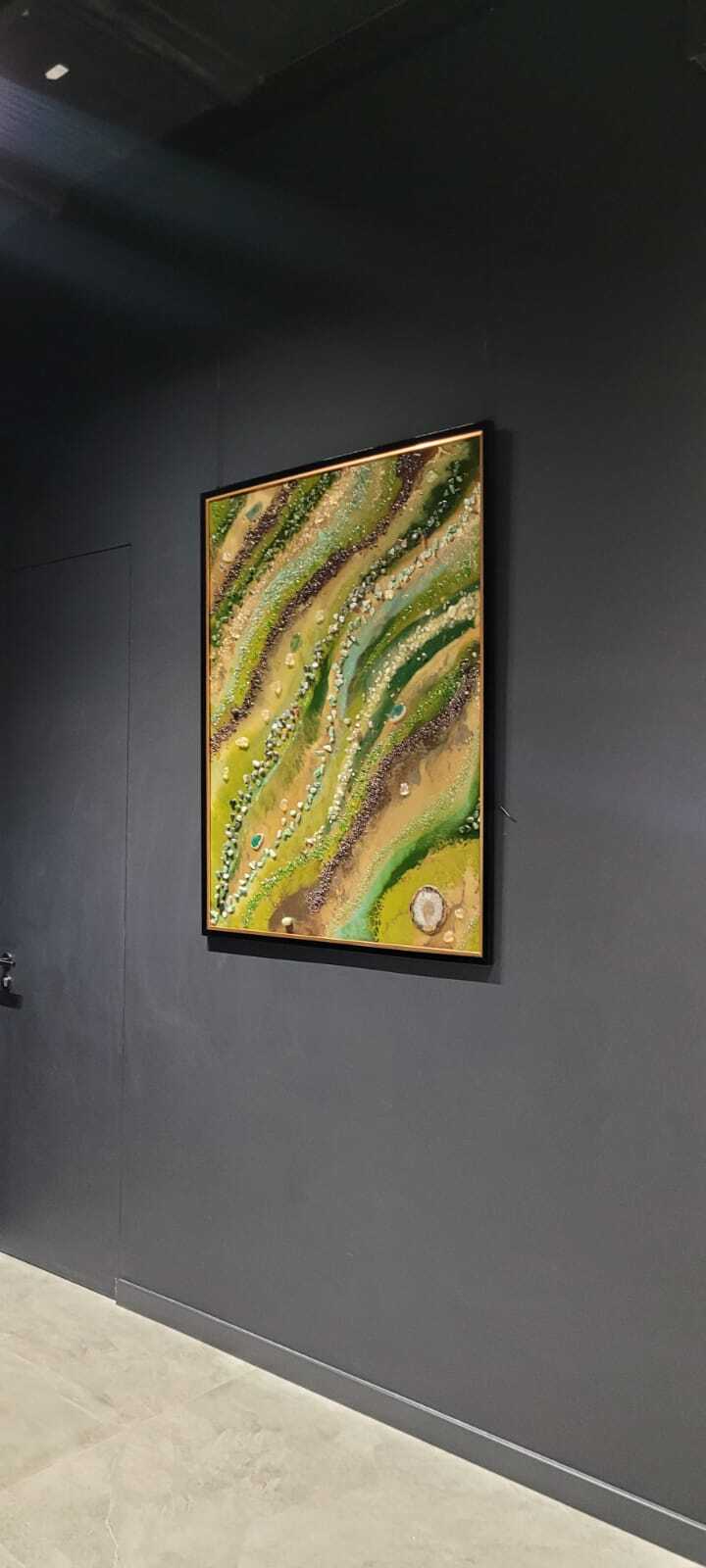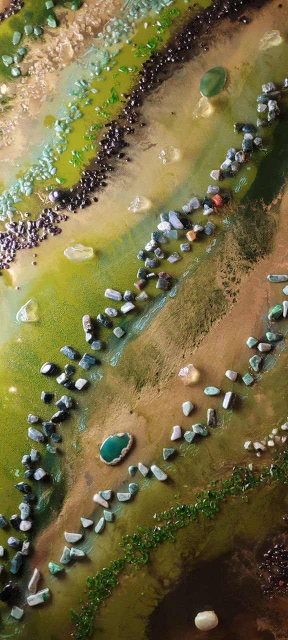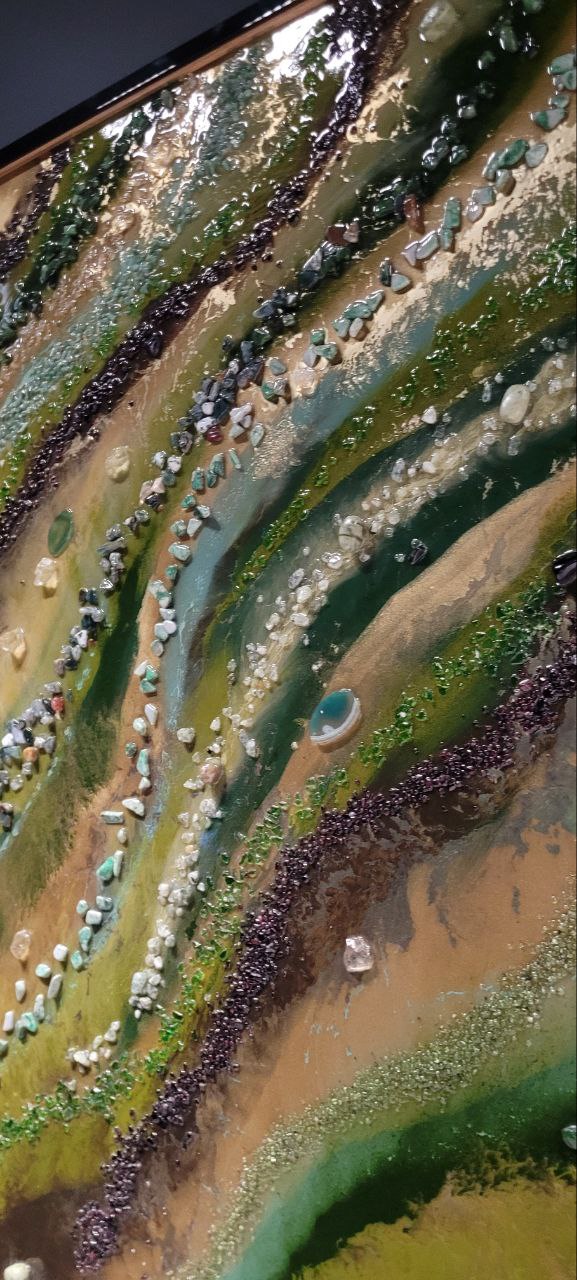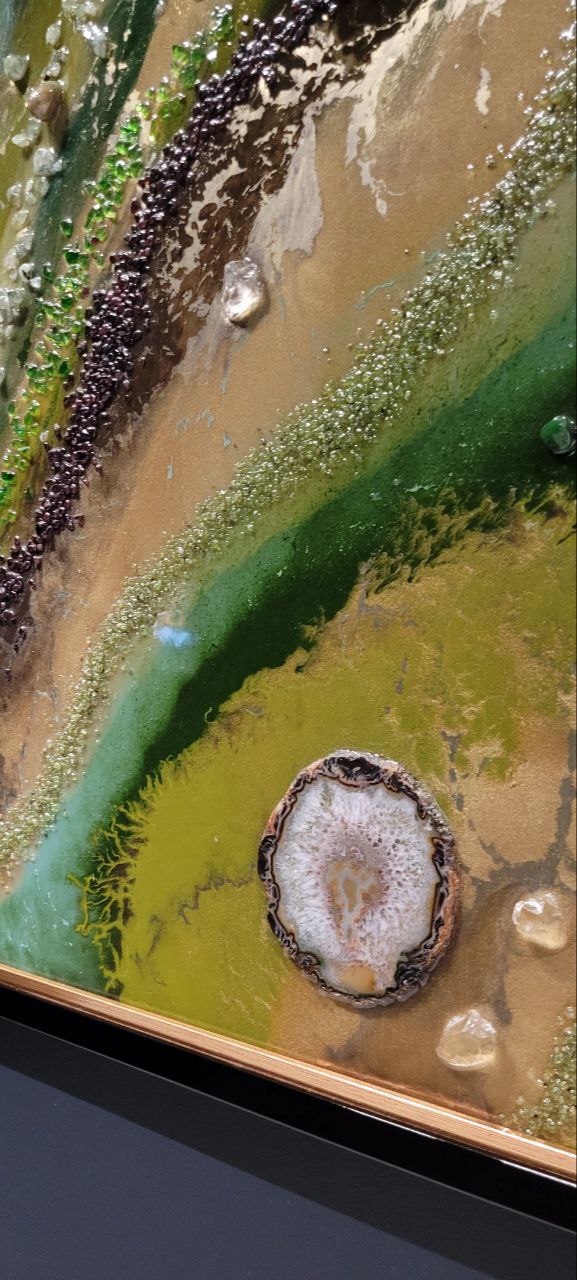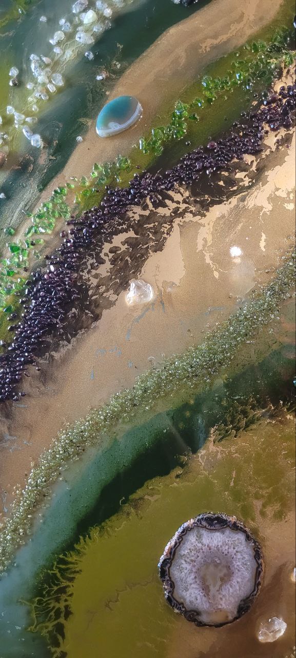 Акриловый холст, эпоксидная смола, золотой пегмент, нефрит срезы агата, гранат, моховой агат, горный хрусталь, хризолит
