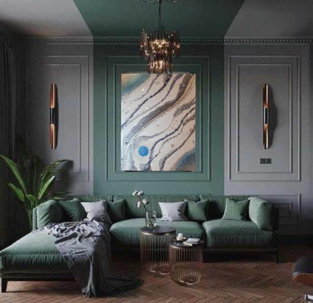 Акриловый холст, эпоксидная смола, кусочки агата, стразы, моховой агат, флюорит, гематит, радужный гематит, зеленый цитрин, нефрит, жадеит, лунный камень, пирит, авантюрин